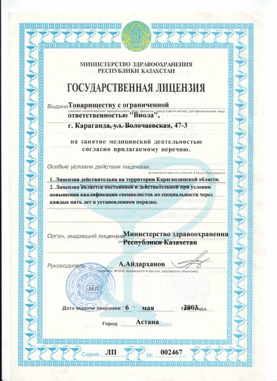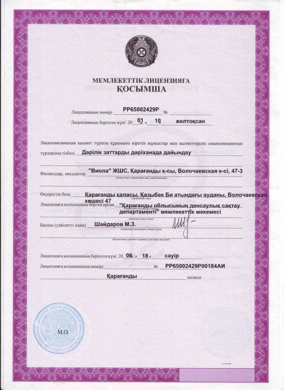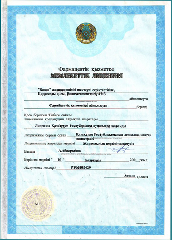 - Государственная лицензия на фармацевтическую деятельность (на государственном языке), (на русском языке)