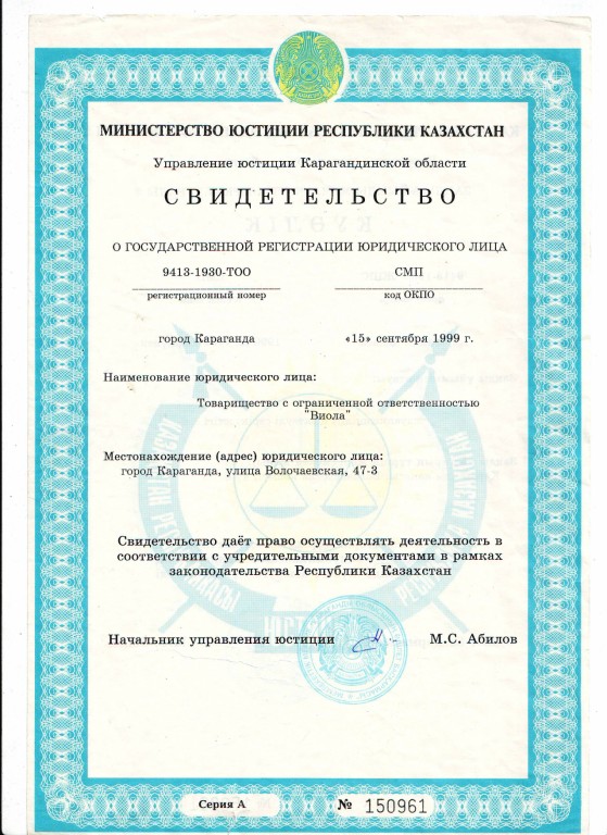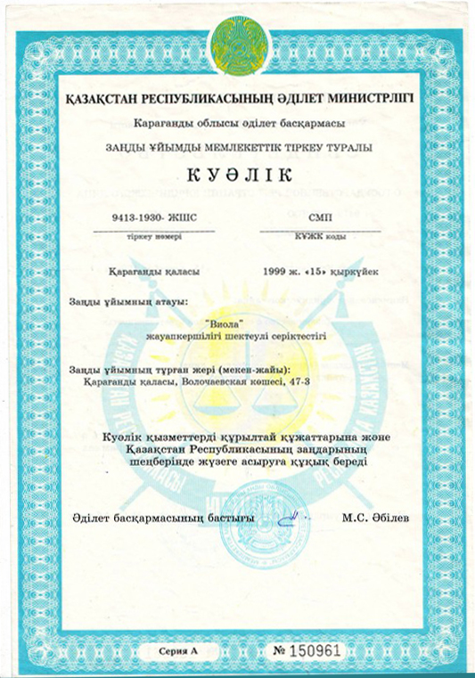- Свидетельство о государственной регистрации юридического лица (на государственном языке), (на русском языке)